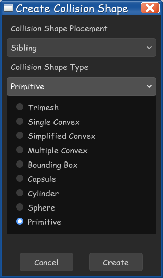 Since our FloorMesh is a primitive shape (a box), we can select the "Primitive" collision shape type to generate a BoxShape3D