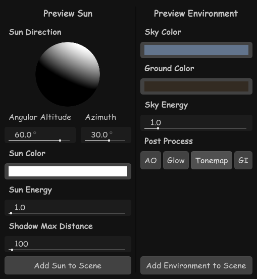 Click "Add Sun to Scene" and "Add Environment to Scene" to create DirectionalLight3D and WorldEnvironment nodes.