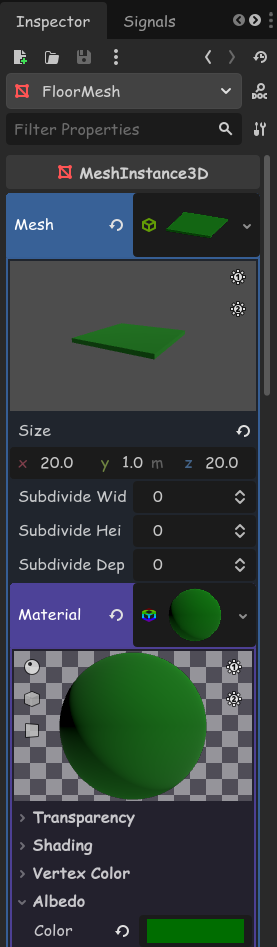 Add a child node to our scene. Make it a MeshInstance3D. Rename it to "FloorMesh".