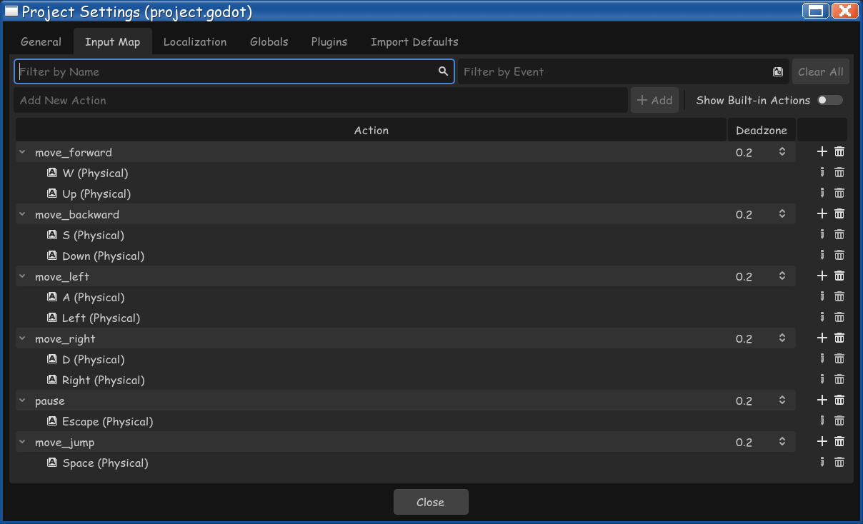 While we're here we'll add jumping to the game. Create a new "jump" action and assign it the spacebar.