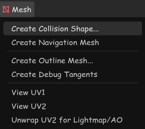 Follow the same steps as above to make a collision shape for the trunk. Select the trunk, open the Mesh menu, select "Create Collision Shape", and make a primitive sibling shape (in this case a cylinder).